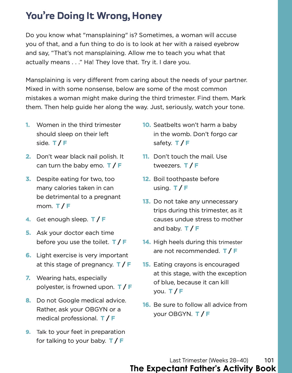 I got to have fun by creating crosswords, word searches, scrambles, quizzes, Mad Libs-style things that we couldn’t call Mad Libs because there’s a copywrite on Mad Libs so forget I said that, and tons of other activities that lead you into the world of parenthood in ways that your grandmother’s baby stories never could. You don’t have to sit in horror and picture doom and gloom. You don’t have grimace over visuals that are better left un-visualized. As someone who was just as stunned as many moms-and-dads-to-be are now, I know it’s all fun and games until someone stops making it fun and games. So I made it fun and games. (excerpts below)