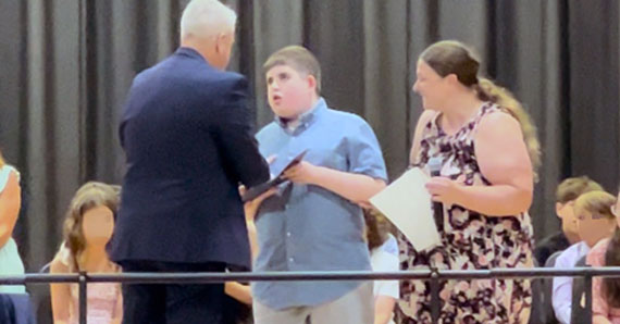 Lucas, as he often does, was marching to his own drummer. He stood up slowly and, once they came over to coax him to the front of the stage, he did just that. However, he didn’t stop at the principal. He stopped next to the principal and stared directly into the audience. Stoically, he stood there, taking in the room before him.