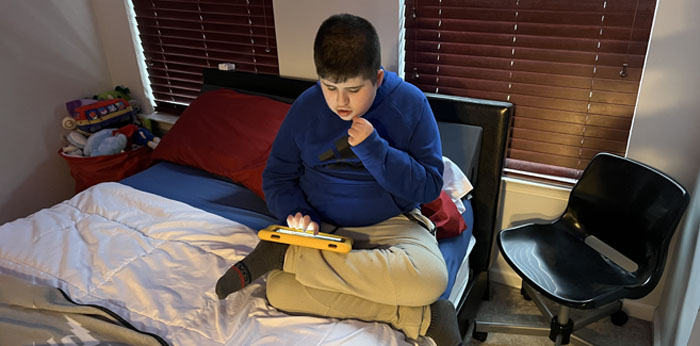 It’s 11:00 in the morning, and I’m at my computer while my 12-year-old non-verbal son, Lucas, is in his room with the gate closed.
