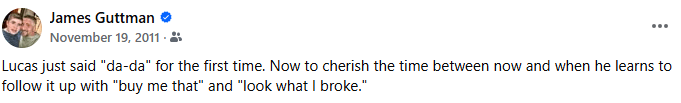 I read something on Facebook the other day that was posted by a stranger. It was a memory that said: Lucas just said “da-da” for the first time.
